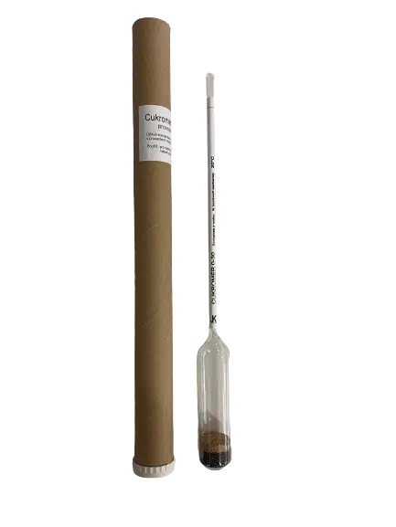 Instrukcja użytkowania: Wlej płyn do cylindra miarowego, który powinien być wyższy niż miernik cukru. Włóż miernik cukru do odmierzonej cieczy tak, aby swobodnie się poruszał. Po uspokojeniu widzimy zmierzoną wartość na skali miernika cukru na poziomie mierzonego płynu. Po pomiarze przepłucz miernik cukru czystą wodą. Pomiar jest najdokładniejszy przy mierzonej temperaturze cieczy 20°C.