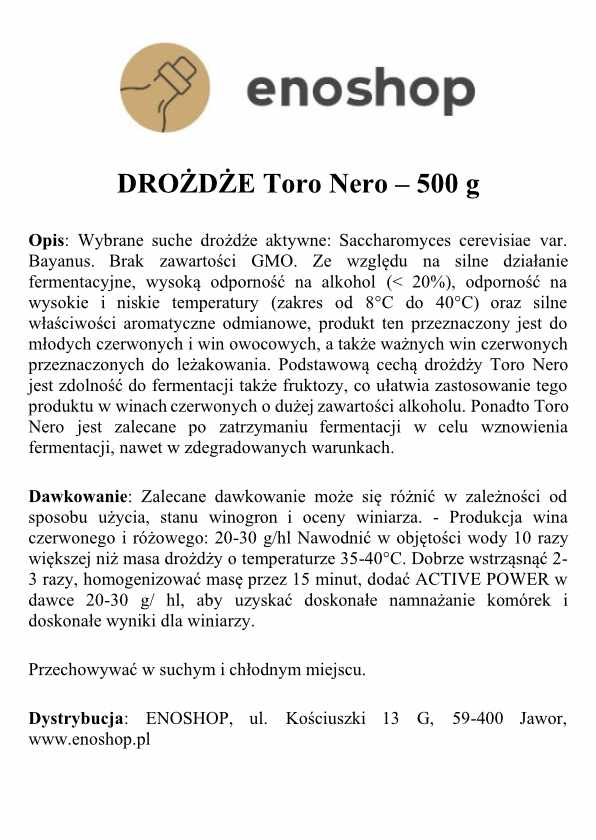 Drożdże Toro Nero (Saccharomyces bayanus) to niezawodny szczep przeznaczony do fermentacji win czerwonych. Charakteryzuje się bardzo wysoką siłą fermentacyjną, odpornością na alkohol do ponad 20% ABV oraz możliwością pracy w szerokim zakresie temperatur (8–38 °C). Dzięki zdolności fermentacji fruktozy, świetnie sprawdzają się w winach o wysokiej zawartości alkoholu oraz w przypadku konieczności restartu fermentacji. Toro Nero nadają winom intensywność, głębię aromatyczną i czysty profil smakowy, zachowując równowagę pomiędzy mocą a elegancją.