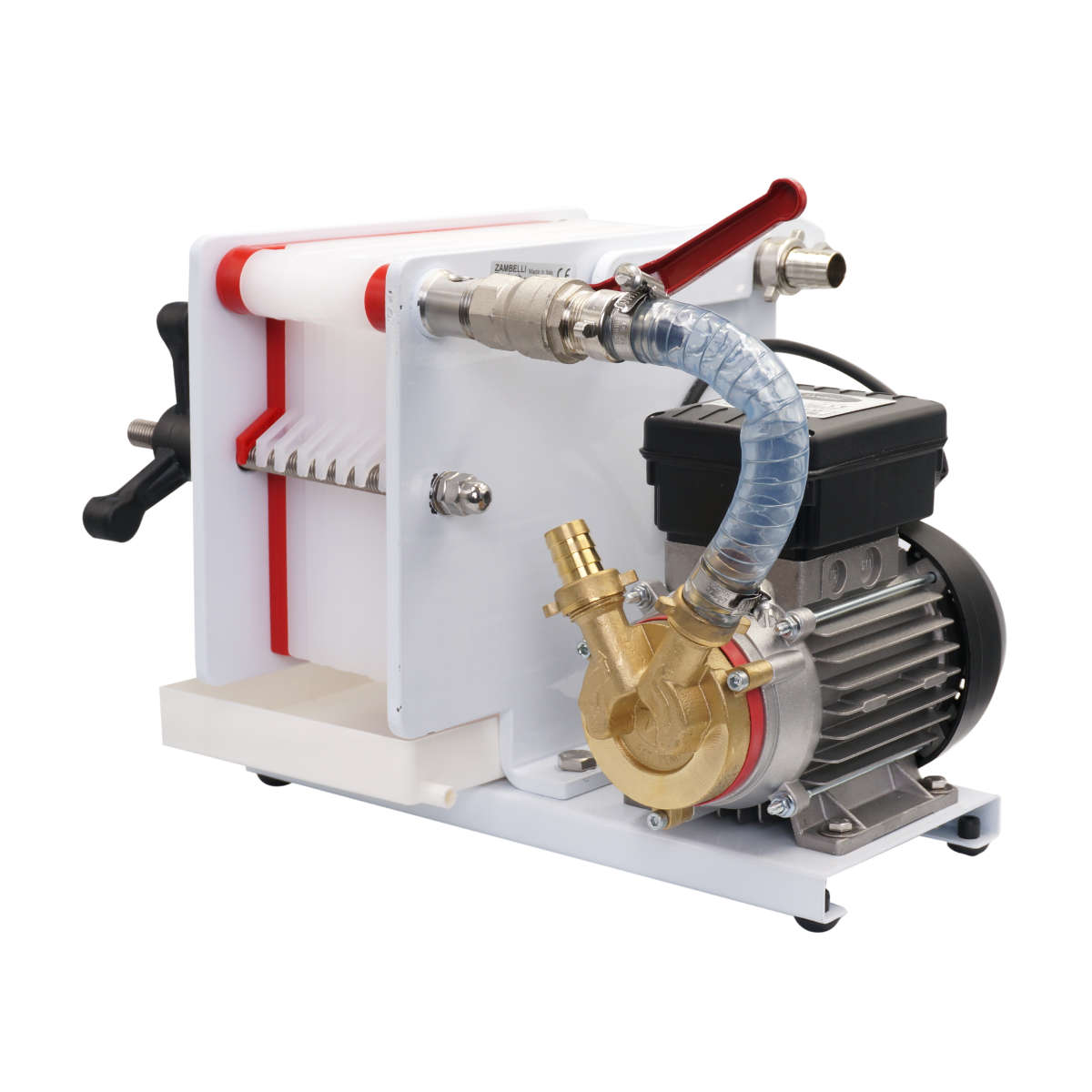 Wyposażony w pompę wirnikową oraz miejsce na 8 płyt filtracyjnych Jest to filtr dedykowany dla małych i hobbystycznych producentów. Przeznacczony do filtracji, białych, różowych i czerwonych win a także miodów pitnych, soków i innych prduktów spożywczych. Wyposażony w mosiężną pompę a także manometr i zawó regulacji ciśnenia. charakterystyka filtra: