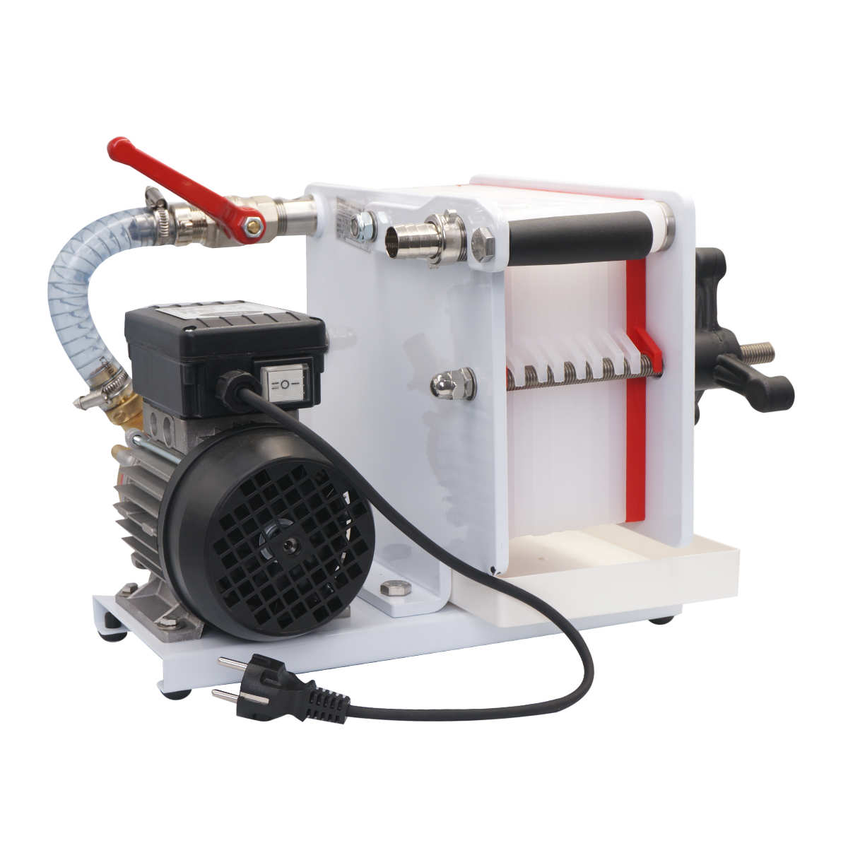 Jest to filtr dedykowany dla małych i hobbystycznych producentów. Przeznacczony do filtracji, białych, różowych i czerwonych win a także miodów pitnych, soków i innych prduktów spożywczych. Wyposażony w mosiężną pompę a także manometr i zawó regulacji ciśnenia.