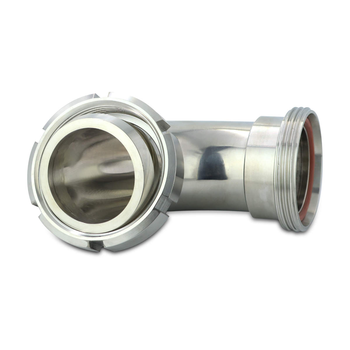 Przedmiotem oferty jest kolano pasujące do złącz zgodnych ze standardem DIN 11851 o średnicy znamionowej 65 mm. Z jednej strony zakończone jest końcówką gwintowaną (uszczelka w zestawie), a z drugiej stożkową z nakrętką. Kąt pomiędzy osiami końcówek wynosi 90 stopni.