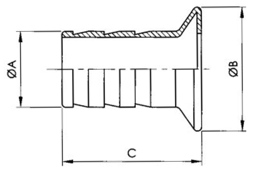 Standard: Garolla Średnica nominalna: DN40 Gatunek stali: 1.4301 (AISI 304) Średnica pod wąż: A = 41 mm Średnica na szczycie stożka: B = 67 mm Długość całkowita: C = 86 mm Stal nierdzewna z gatunku 1.4301 charakteryzuje się dużą odpornością na ogólną korozję, przez co doskonale nadaje się do stosowania przy produktach spożywczych i alkoholach. Do pracy przy agresywnych środkach chemicznych zalecamy wybór stali kwasoodpornej z gatunku 1.4404 (AISI 316L).