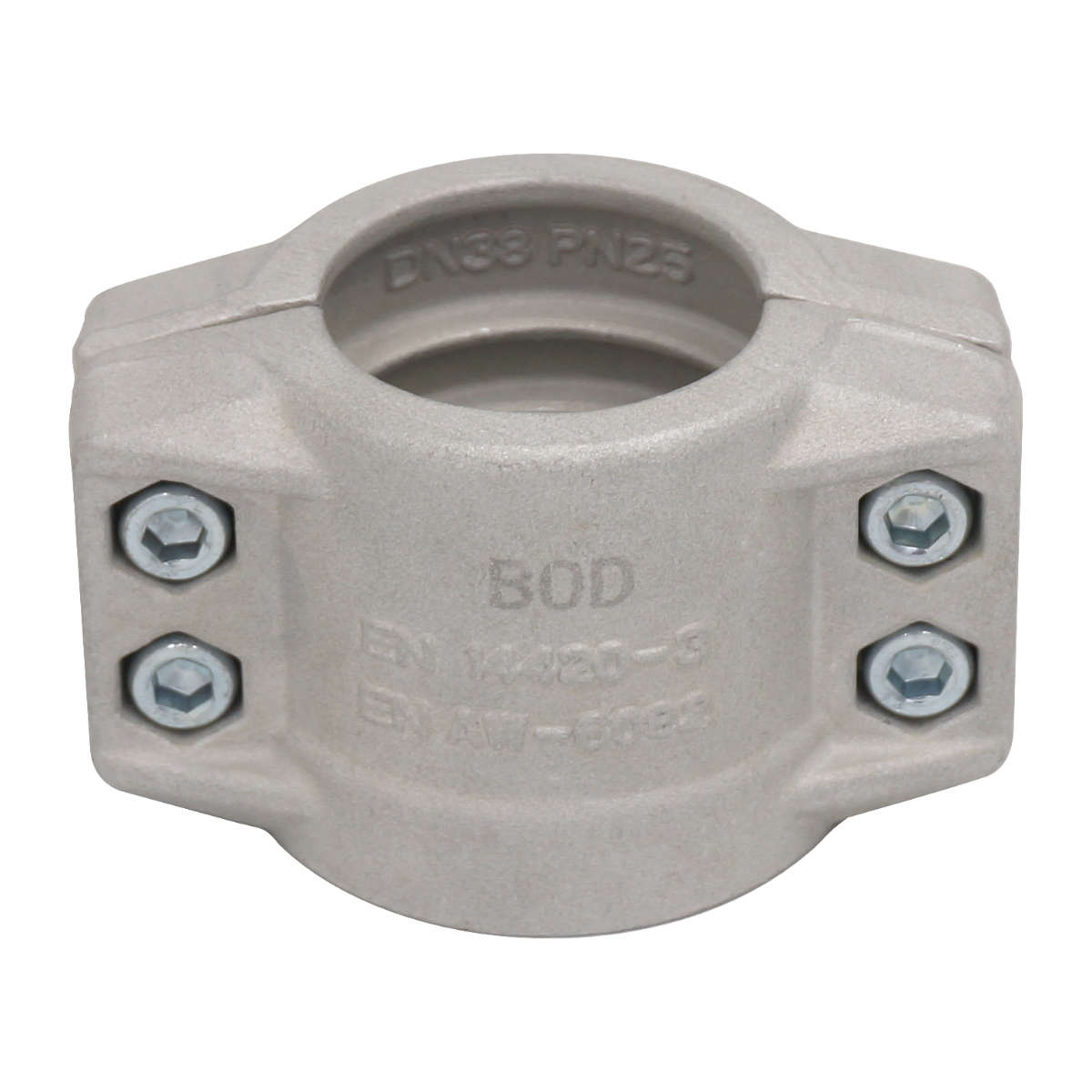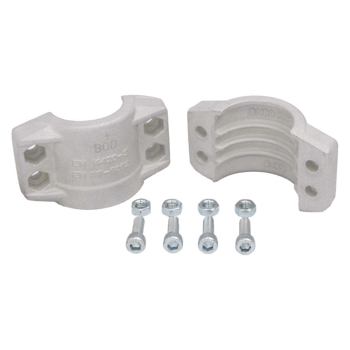 Zestaw zawiera dwie aluminiowe połówki obejmy oraz komplet śrub ze stali ocynkowanej.