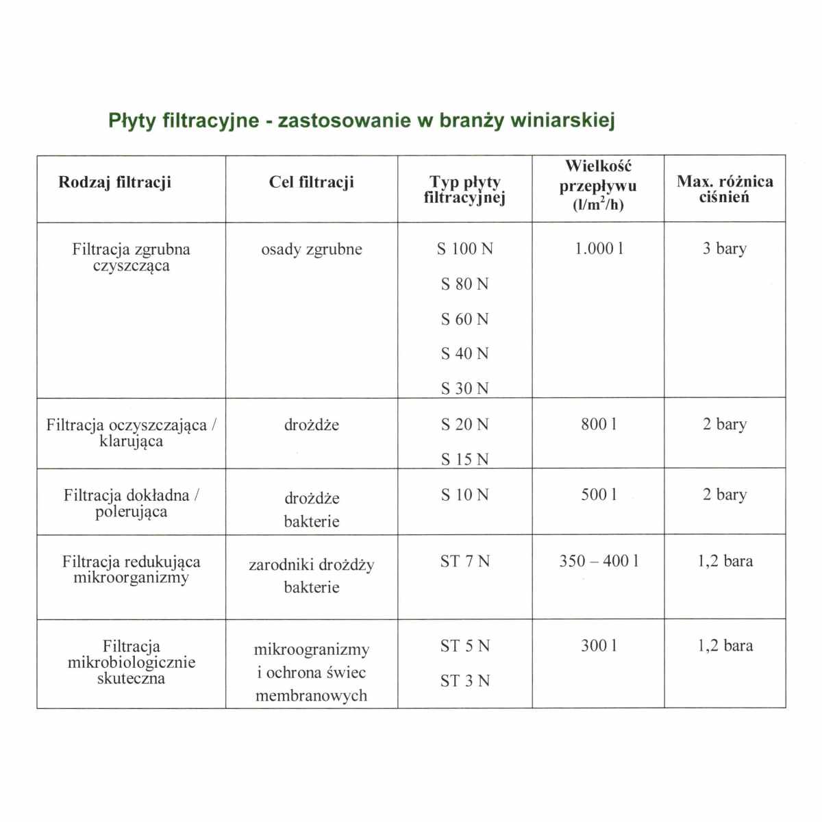 – przestrzeganie zalecanych wydajności (l/m2/h) i maksymalnej dopuszczalnej różnicy ciśnień (jak przedstawiono w tabelkach dla określonych branż)