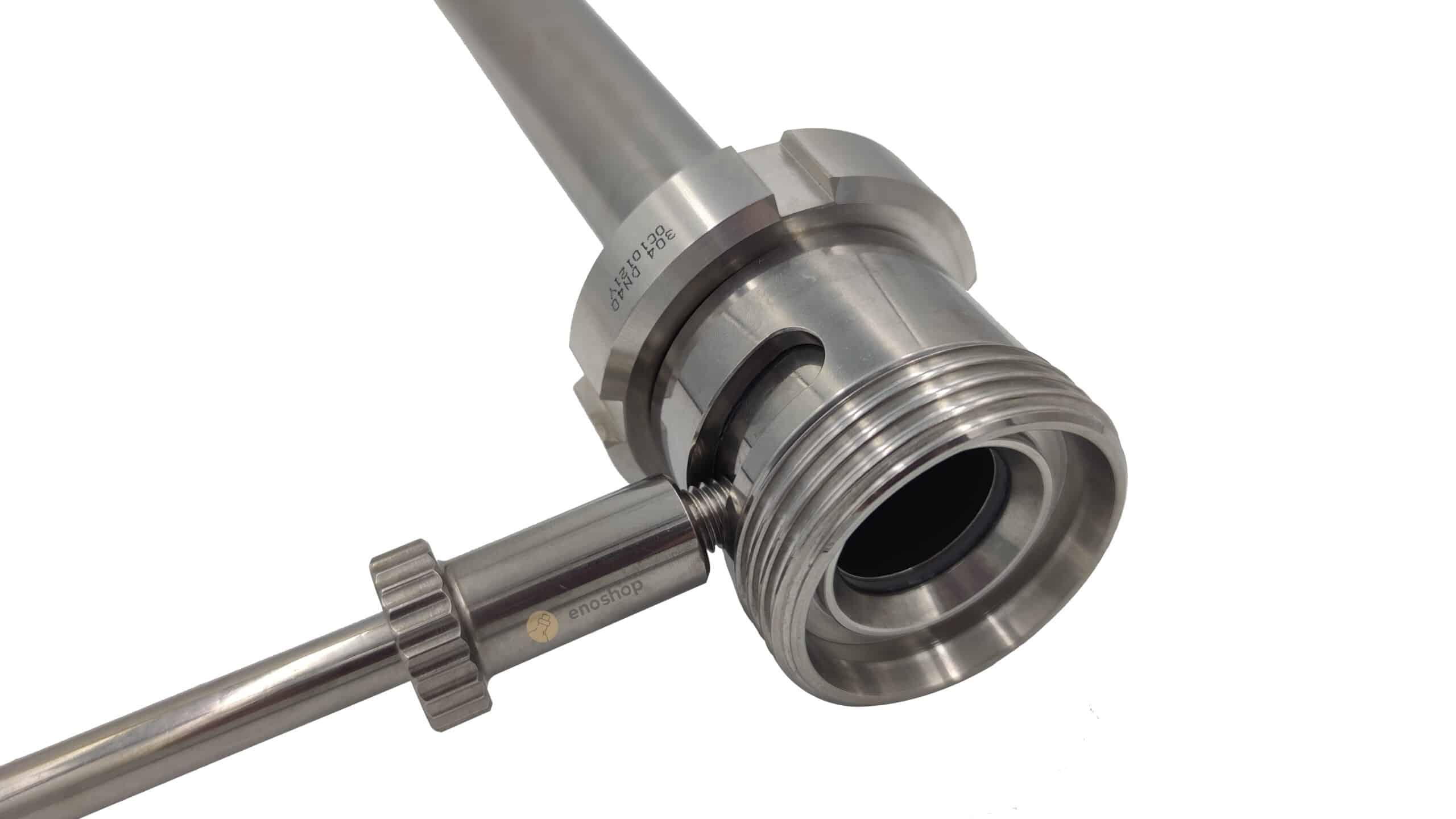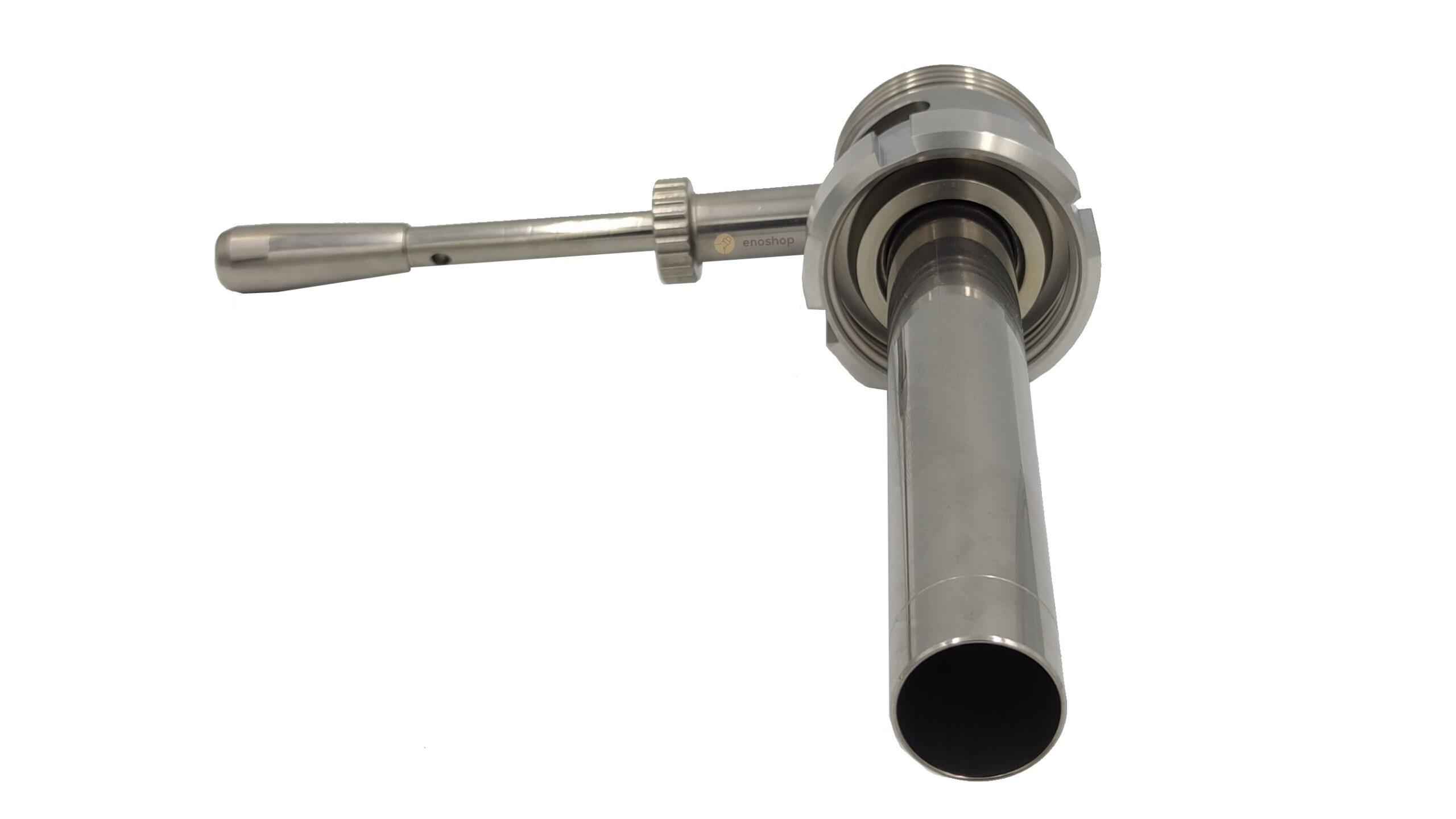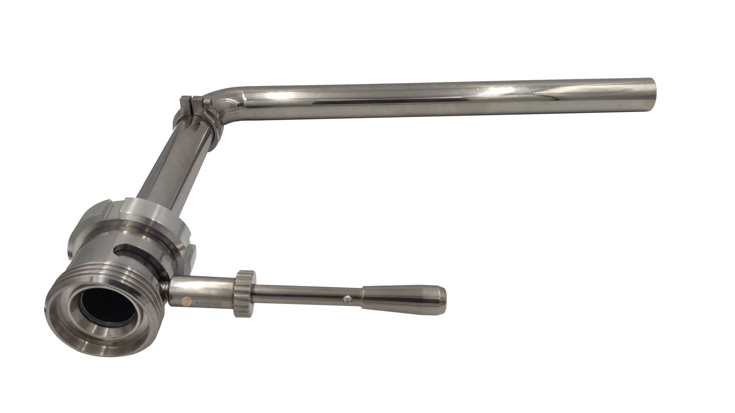 Oferowany dekanter dedykowany jest do zbiorników ze stali nierdzewnej wyposażonych w przyłącze zaworu czystego wypróżnienia w standardzie DIN 11851 i rozmiarze DN 40. Istotą jego działania jest wybór poziomu, z którego pobierany jest produkt ze zbiornika dzięki czemu możliwe jest precyzyjne zlewanie płynu znad osadu. Położenie końca rury dekantera można regulować za pomocą dźwigni i zablokować nakrętką. Zestaw składa się z dwóch części: kolana i zaworu regulacji położenia. Zawór regulacyjny należy zamontować pomiędzy zaworem spustowym, a przyłączem zbiornika. Kolano natomiast należy włożyć do zbiornika z zewnątrz, założyć i przykręcić na zamontowany uprzednio króciec będący częścią zaworu regulacyjnego – z pewnością pomocny okaże się właz inspekcyjny w zbiorniku. Połączenie kolana z króćcem zaworu uszczelnione jest o-ringiem i blokowane obejmą dokręcaną przy pomocy klucza imbusowego. Położenie kolana względem dźwigni zaworu można dowolnie regulować przed dokręceniem śruby mocującej kolano w zbiorniku. Na króćcu zostało oznaczone miejsce do którego powinno zostać wciśnięte kolano. Do poprawnego uszczelnienia gwintu zewnętrznego konieczne jest posiadanie odpowiedniej uszczelki,