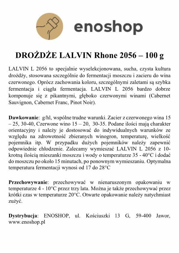 Drożdże Lallvin Rhone 2056 to specjalnie wyselekcjonowany szczep do fermentacji czerwonych win, który pozwala zachować intensywną barwę, zapewnia szybką i ciągłą fermentację oraz wydobywa pełnię aromatów owocowych i przyprawowych. Idealne do win o wyraźnym charakterze, w których zależy Ci na głębokiej strukturze, bogatym kolorze i czystym bukiecie.