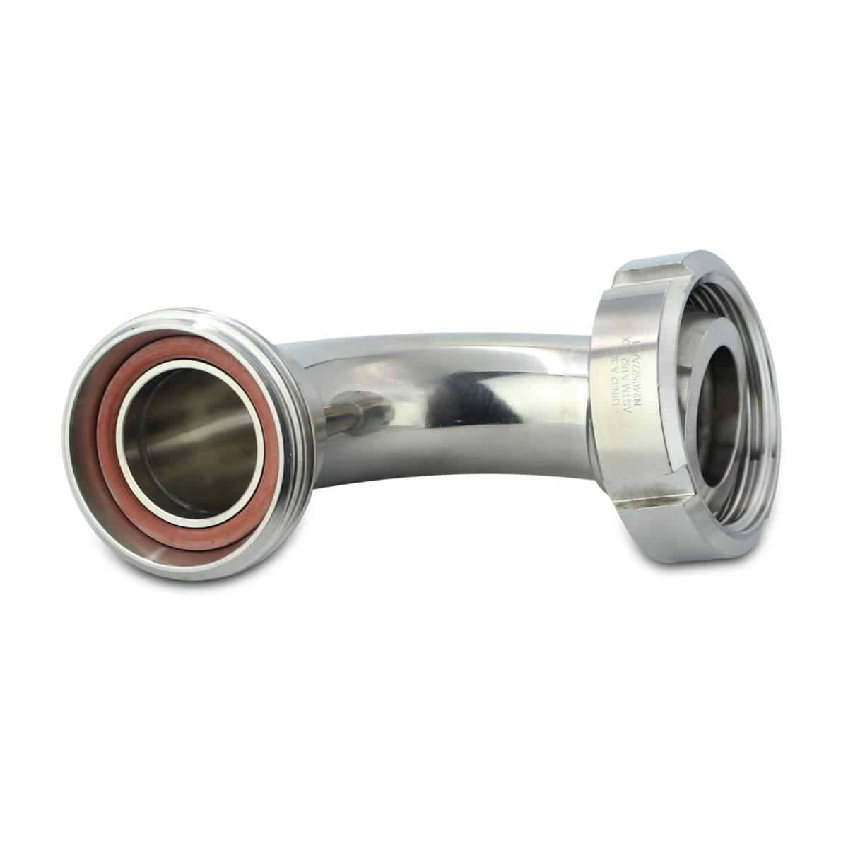 Przedmiotem oferty jest kolano pasujące do złącz zgodnych ze standardem DIN 11851 o średnicy znamionowej 32 mm. Z jednej strony zakończone jest końcówką gwintowaną (uszczelka w zestawie), a z drugiej stożkową z nakrętką. Kąt pomiędzy osiami końcówek wynosi 90 stopni.