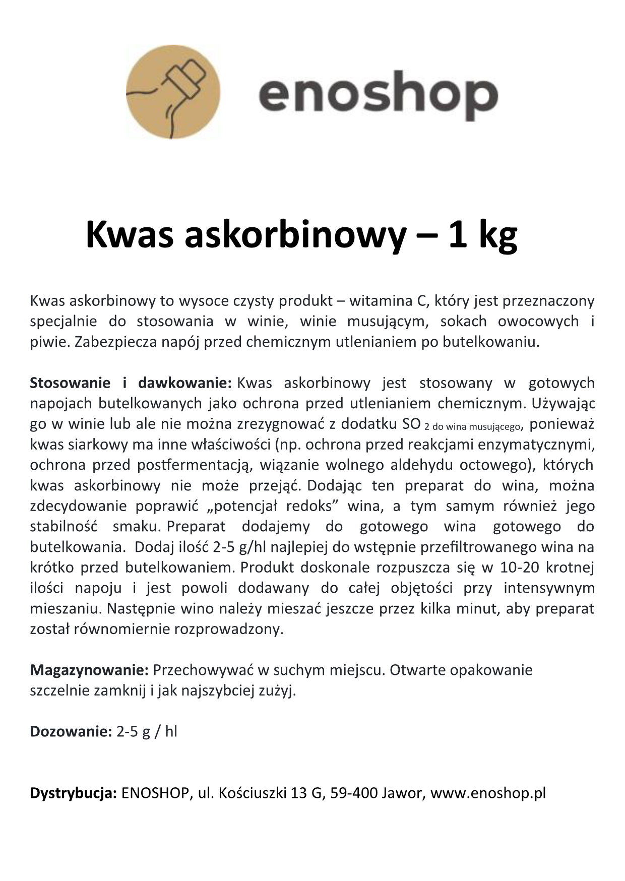 Stosowanie i dawkowanie: Kwas askorbinowy jest stosowany w gotowych napojach butelkowanych jako ochrona przed utlenianiem chemicznym. Używając go w winie lub ale nie można zrezygnować z dodatku SO 2 do wina musującego, ponieważ kwas siarkowy ma inne właściwości (np. ochrona przed reakcjami enzymatycznymi, ochrona przed postfermentacją, wiązanie wolnego aldehydu octowego), których kwas askorbinowy nie może przejąć. Dodając ten preparat do wina, można zdecydowanie poprawić „potencjał redoks” wina, a tym samym również jego stabilność smaku. Preparat dodajemy do gotowego wina gotowego do butelkowania. Dodaj ilość 2-5 g/hl najlepiej do wstępnie przefiltrowanego wina na krótko przed butelkowaniem. Produkt doskonale rozpuszcza się w 10-20 krotnej ilości napoju i jest powoli dodawany do całej objętości przy intensywnym mieszaniu. Następnie wino należy mieszać jeszcze przez kilka minut, aby preparat został równomiernie rozprowadzony.