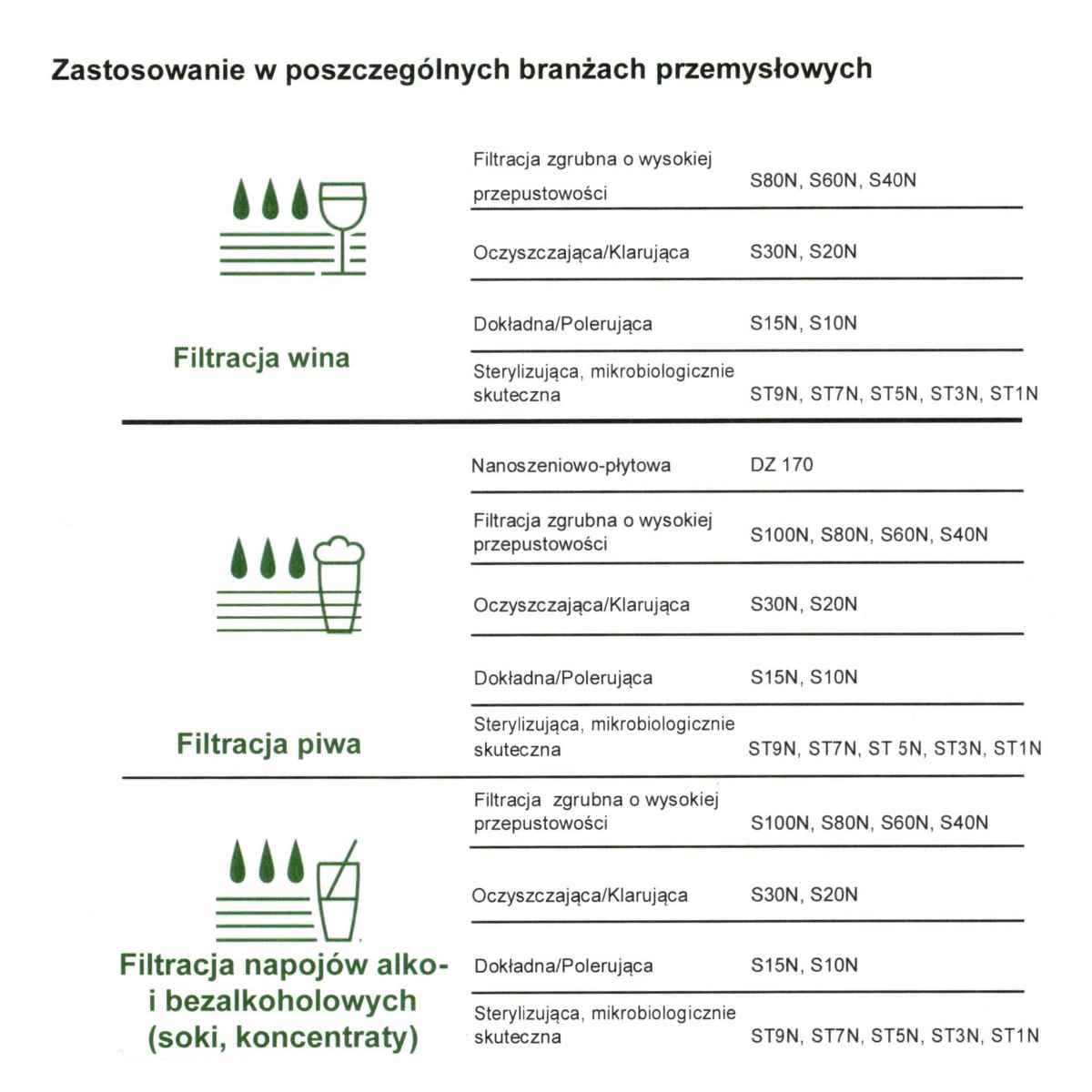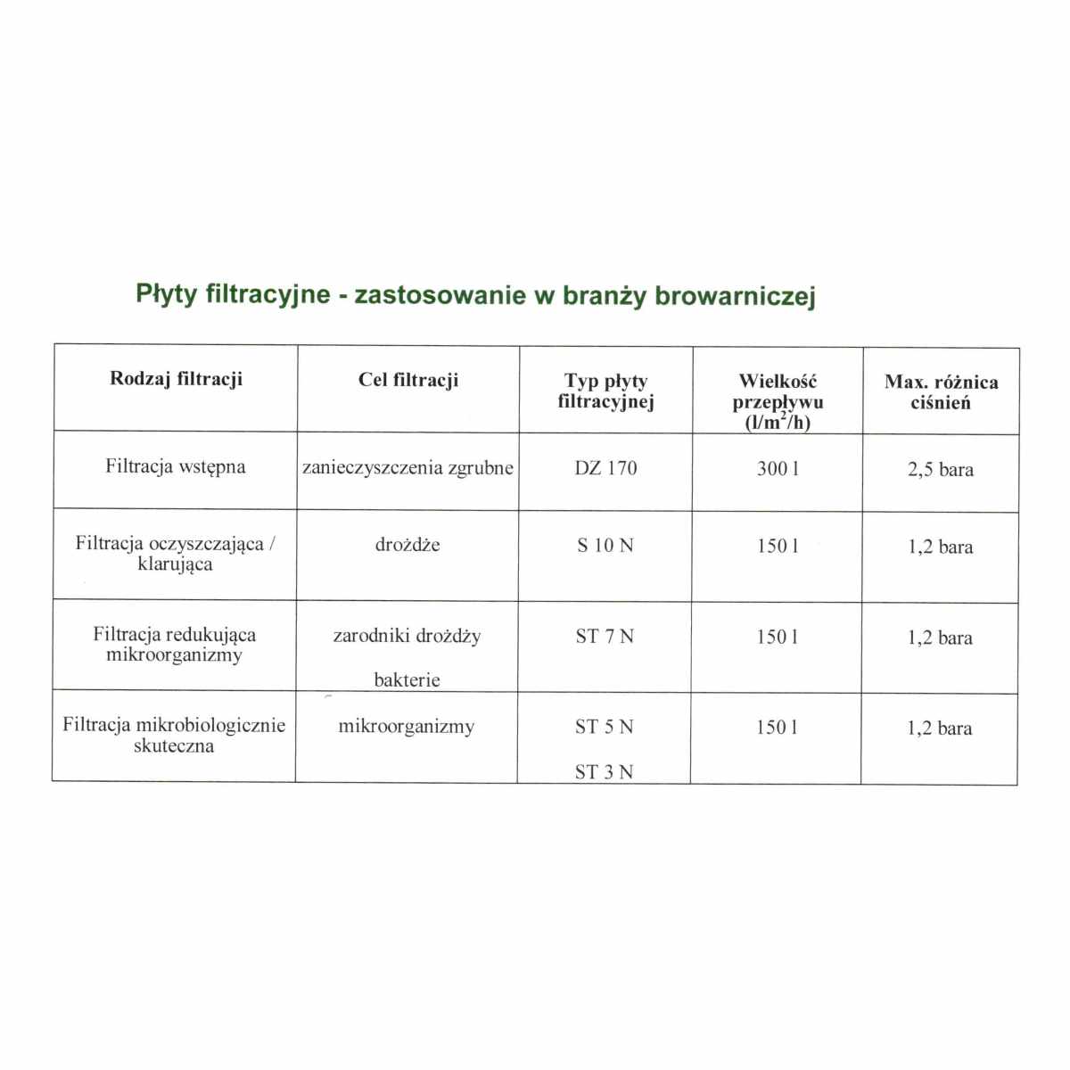 – przestrzeganie zalecanych wydajności (l/m2/h) i maksymalnej dopuszczalnej różnicy ciśnień (jak przedstawiono w tabelkach dla określonych branż)