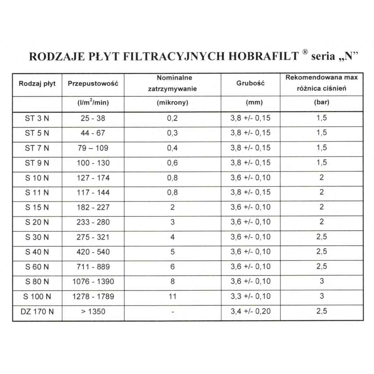 Wytwarzane są z wyselekcjonowanych ziem okrzemkowych, perlitów oraz wysokiej jakości mas celulozowych. PRZECHOWYWANIE PŁYT FILTRACYJNYCH Płyty filtracyjne należy przechowywać w suchym, wentylowanym środowisku bez obcych zapachów i zawsze w oryginalnym opakowaniu. Ze względu na możliwą kondensację wody konieczne jest unikanie ekstremalnych zmian temperatury., zwłaszcza od wysokiej do niskiej. Zalecamy używanie płyt filtracyjnych w ciągu 36 miesięcy od daty produkcji. INSTRUKCJA UŻYTKOWANIA Zakładanie płyt filtracyjnych do urządzenia Strona wejściowa płyt filtracyjnych jest chropowata, strona wyjściowa jest gładka (strona wylotowa zawiera napis Hobrafilt, rodz. płyty i nr serii). Należy dopilnować, aby płyty były umieszczone centralnie w taki sposób, aby wystawały nieznacznie poza krawędzie płyty oporowej (metalowej lub z tworzywa sztucznego) znajdującej się w filtrze. NIE NALEŻY UŻYWAĆ PŁYT USZKODZONYCH/POŁAMANYCH. Nawilżenie płyt filtracyjnych Filtr powinien być lekko dociśnięty i napełniany wodą poprzez powolne otwieranie zaworu wlotowego. Jednocześnie powinien być ograniczony odpływ wody z filtra, aby wytworzyć ciśnienie ok 20 kPA (0,2 bara). Przez ok. 5 minut wpuszczać wodę, aby filtr całkowicie się wypełnił, a płyty zostały dokładnie namoczone. Następnie należy przerwać podawanie wody., a filtr z płytami max. docisnąć. Płukanie płyt filtracyjnych Płukanie płyt filtracyjnych przed użyciem jest czynnością absolutnie konieczną, nieuniknioną dla bezproblemowego użycia płyt. Samo płukanie powinno trwać od około 10 do 15 minut., odbywa się w kierunku filtracji przy tej samej wydajności (l/m2/h), jak późniejsza filtracja produktu. Płukanie powinno trwać do momentu, kiedy woda przepływająca przez filtr będzie czysta i bez zapachu. Warunki odpowiedniej filtracji – powolny rozruch i powolne zatrzymanie – zapewnienie stałego i równomiernego przypływu płynu – niewskazane są nagłe zmiany natężenia filtracji – przestrzeganie zalecanych wydajności (l/m2/h) i maksymalnej dopuszczalnej różnicy ciśnień (jak przedstawiono w tabelkach dla określonych branż) – unikanie skoków ciśnienia (np. w przypadku braku aktywności linii rozlewniczej) – zastosowanie powrotu filtratu przed pompę (baypass) – jeśli to możliwe, nie przerywać filtracji oraz nie dopuścić do zasysania powietrza. Sterylizacja – odbywa się w obiegu zamkniętym. Sterylizacja filtra i wstawionych płyt filtracyjnych odbywa się zgodnie z kierunkiem filtracji. Sterylizację można przeprowadzić na dwa sposoby:
